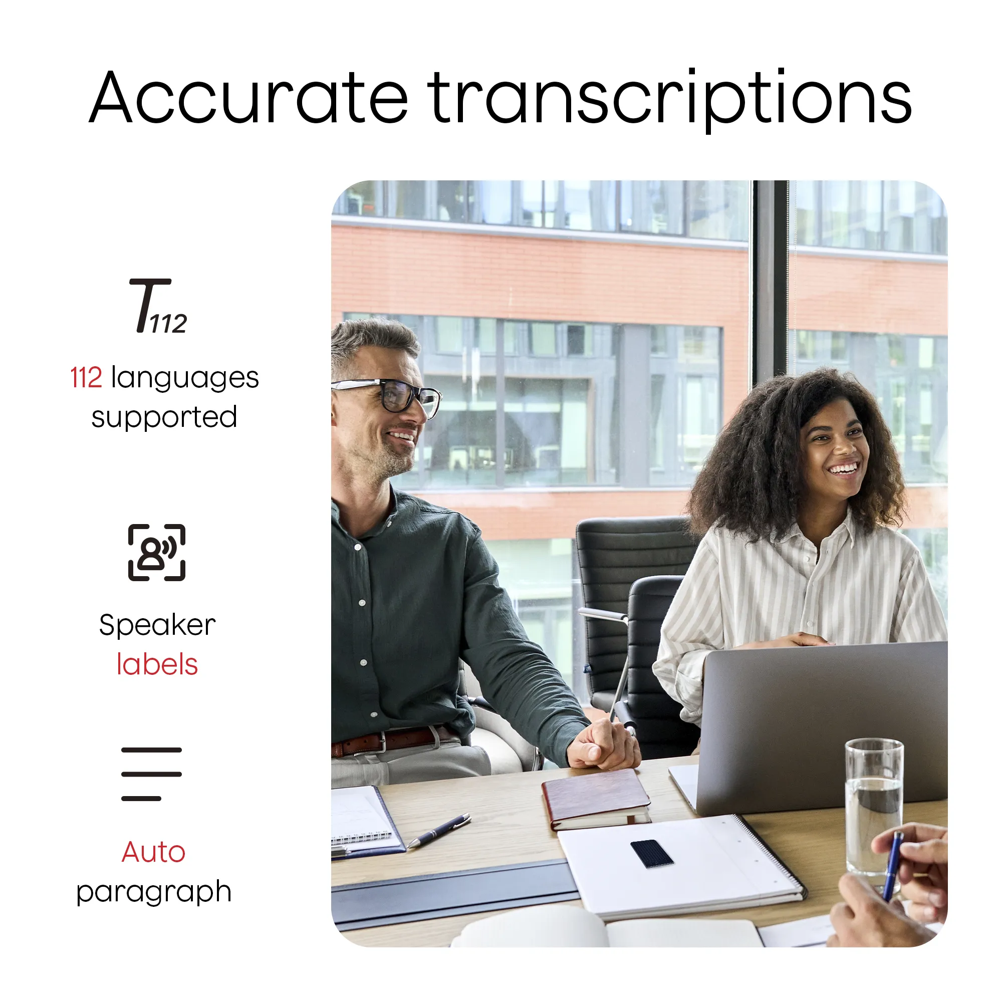- AI-transkription på 112 språk som drivs av ledande stora språkmodeller som GPT-5.2, Claude Sonnet 4.5 och Gemini 3 Pro - ger upp till 95 % noggrannhet
