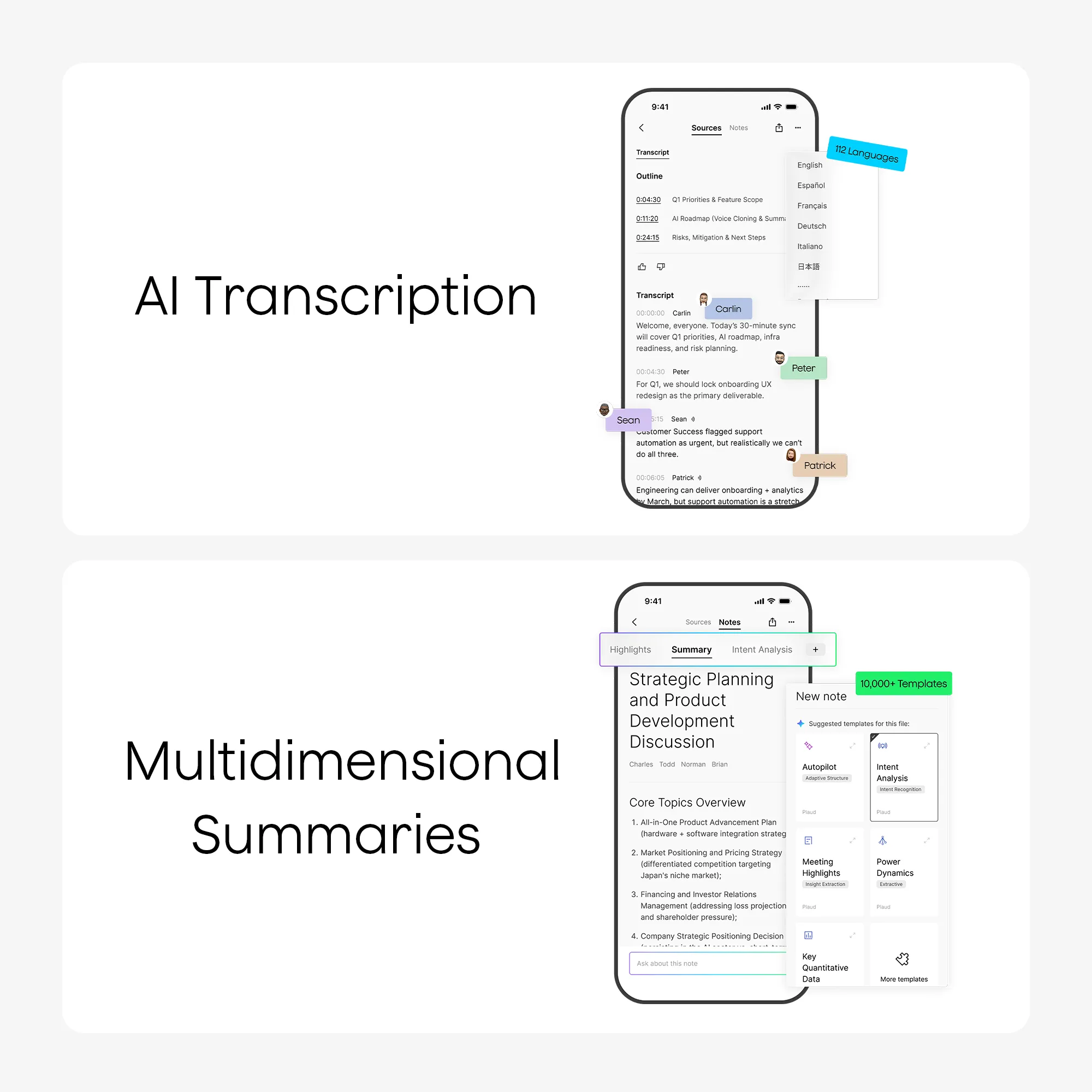 Plaud Note omvandlar inspelningar till användbar kunskap med automatisk språkdetektering, talaretiketter och stöd för anpassad vokabulär (ordlista) för förbättrad noggrannhet. AI-genererade sammanfattningar och strukturerade anteckningar visar viktiga punkter och åtgärder med hjälp av 10 000+ AI-drivna mallar i olika branscher. Markera viktiga ögonblick, lägg till maskinskrivna anteckningar eller bilder och använd Ask PLAUD för att direkt fråga efter utskrifter och sammanfattningar utan att spela upp inspelningarna igen.