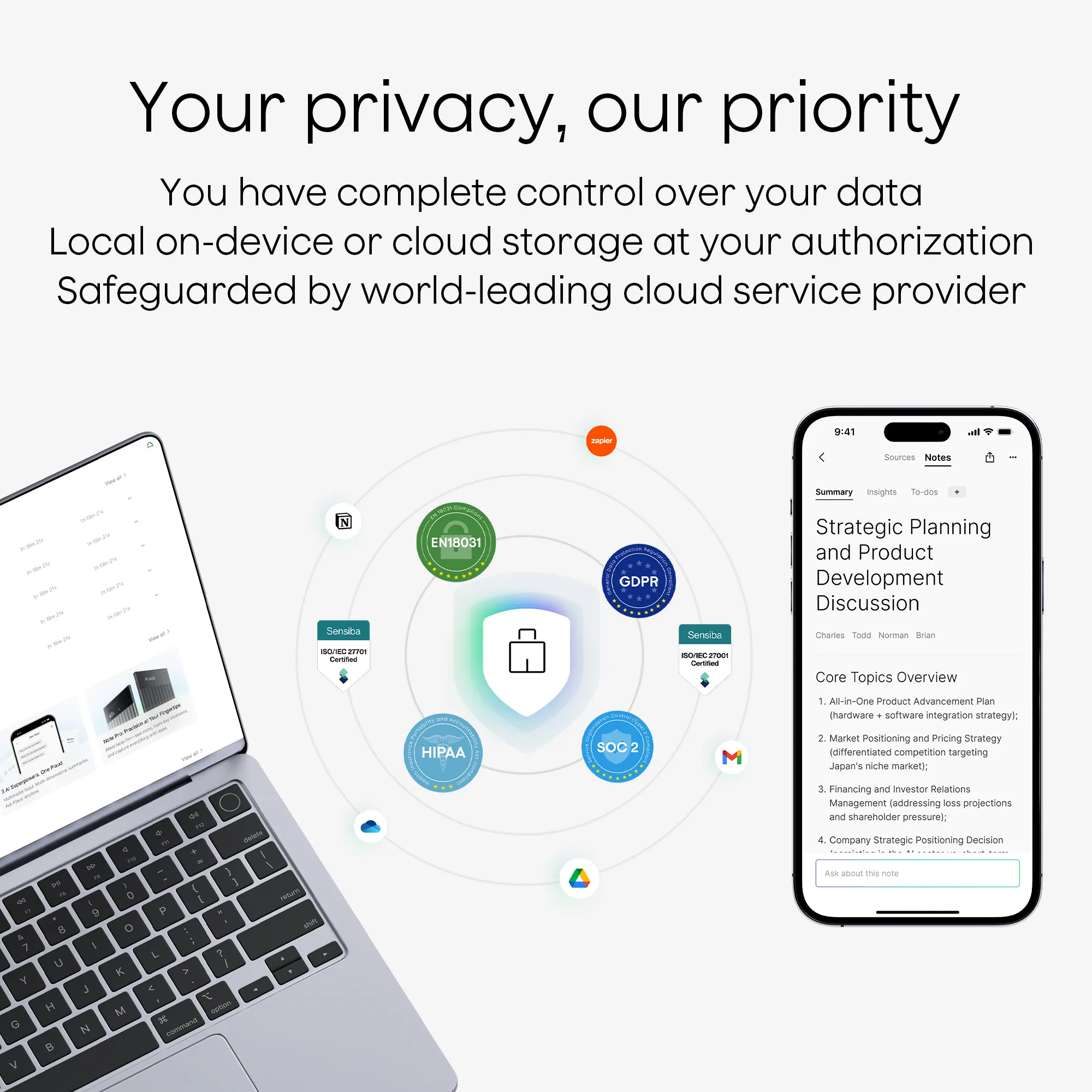 Plaud är helt GDPR-kompatibel, vilket förstärker Plaud:s engagemang för de högsta standarderna för dataskydd. Förutom SOC 2 typ II och HIPAA-överensstämmelse skyddas dina inspelningar och AI-genererade anteckningar alltid med kryptering av företagsklass - vilket säkerställer att yrkesverksamma i hela Europa och världen kan använda PLAUD med fullt förtroende för deras integritet.