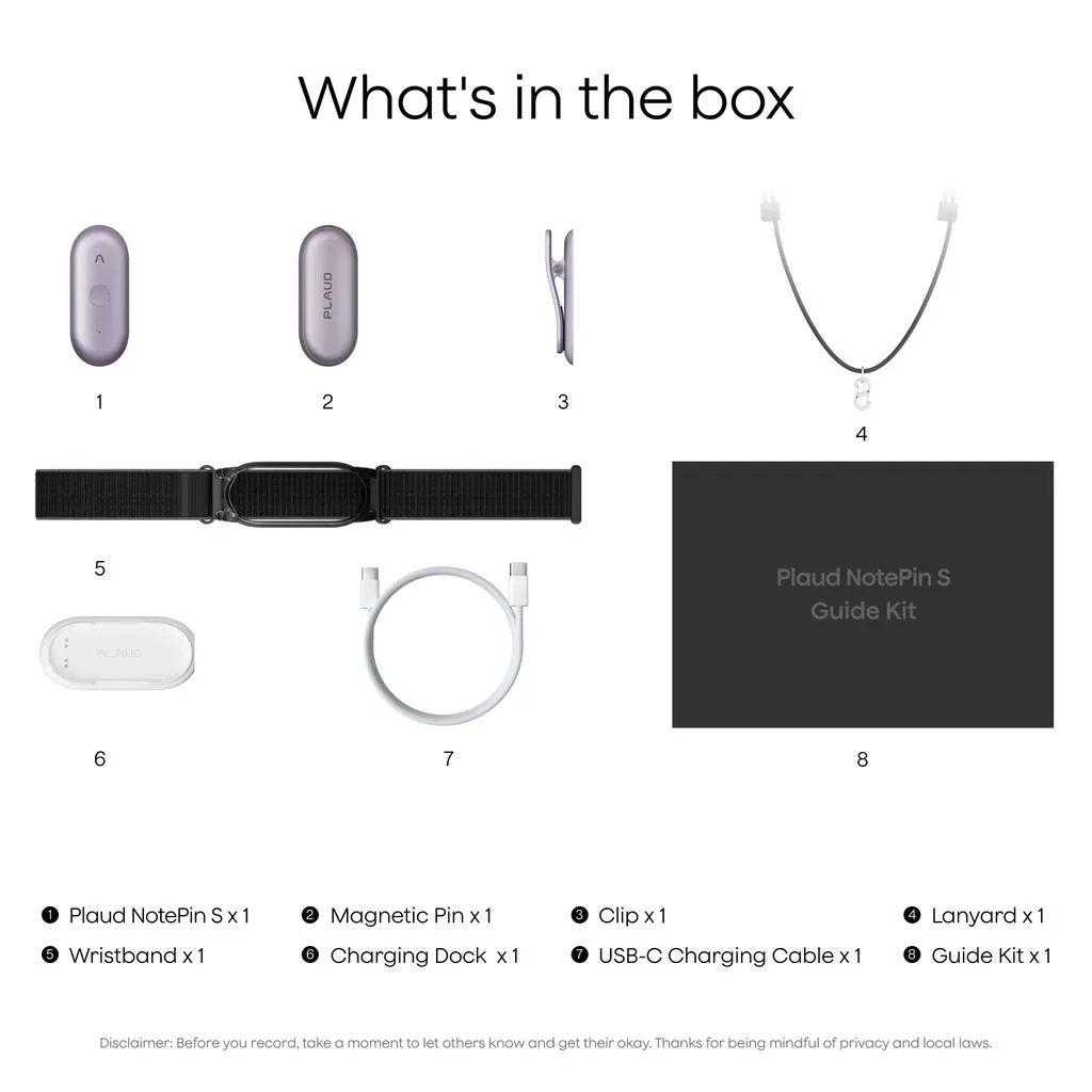 I paketet ingår NotePin S, magnetisk pin, clips, halsband, armband, laddningsdocka, USB-C kabel.