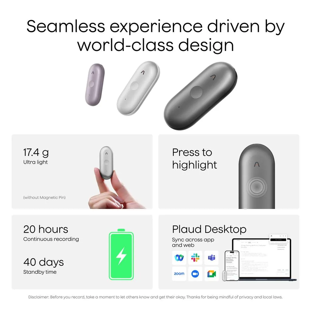 - Sömlös molnintegration och åtkomst med den kostnadsfria appen PLAUD, samt PLAUD Web och PLAUD Desktop